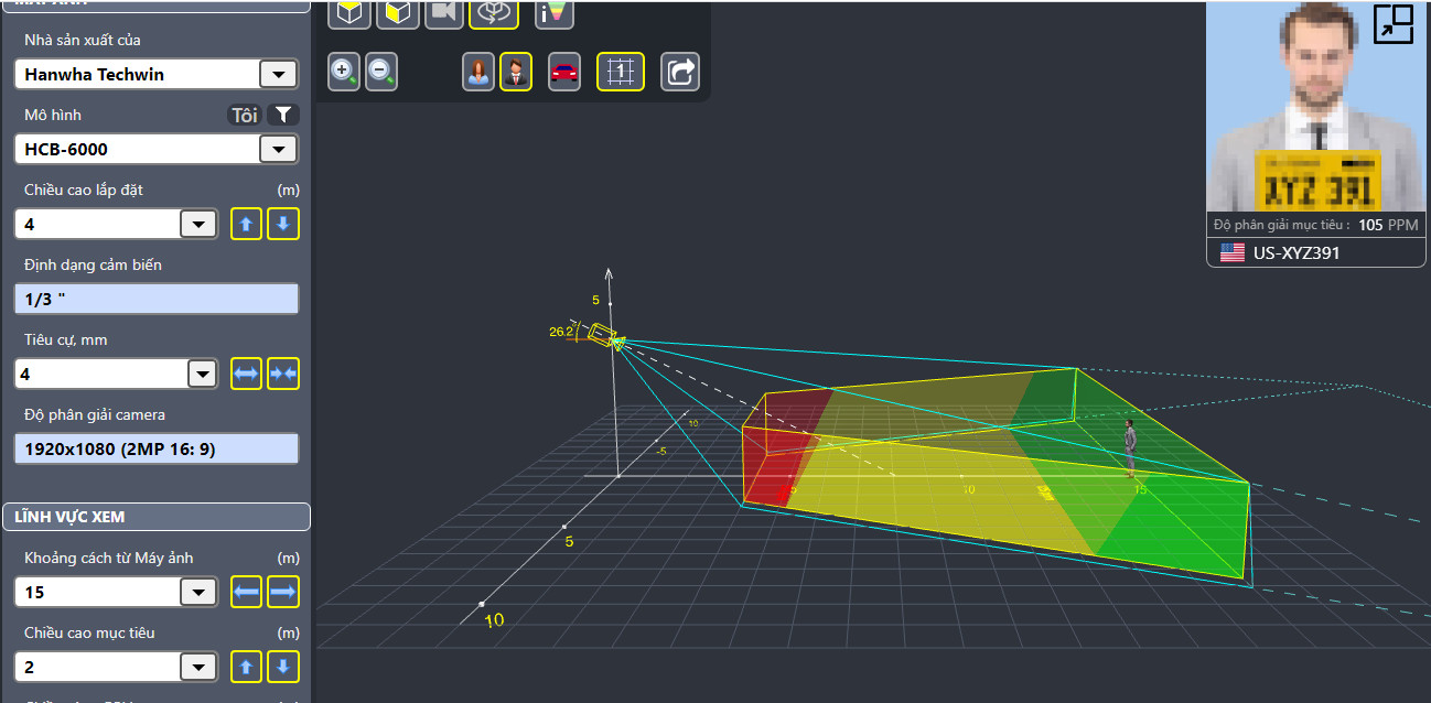 Model, định dạng cảm biến, độ phân giải, độ cao lắp đặt,... phần mềm sẽ cho hình ảnh mô phỏng như sau.