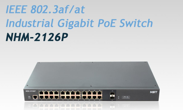 Switch PoE Công nghiệp NHM-2126P – 24 Cổng PoE GbE + 2 Cổng SFP được sử dụng cho mạng vòng nhanh công nghiệp, camera quan sát đường bộ hoặc đường sắt, xây dựng dịch vụ đa phương tiện, camera quan sát trong Thành phố thông minh, mạng LAN không dây trong khu vực môi trường khắc nghiệt.