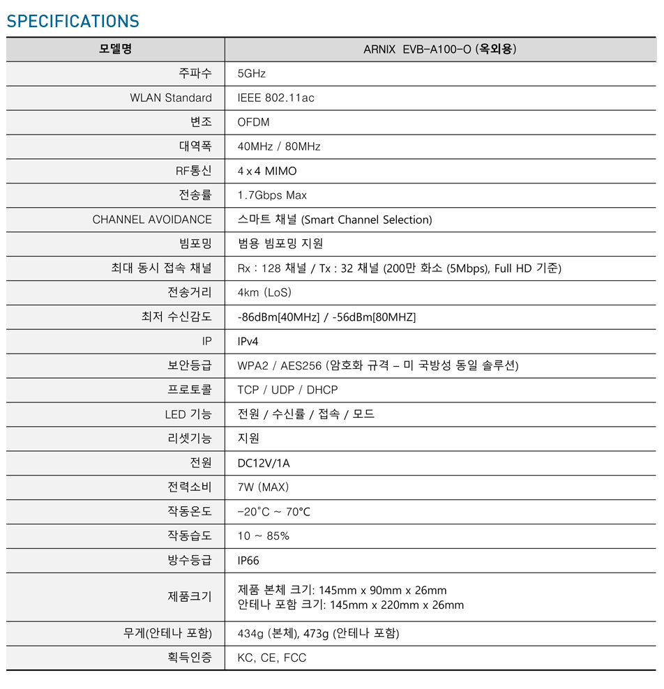 Thiết bị truyền dẫn không dây EVB-A100-O Khoảng cách 4 Km, ngoài trời, không bị cản. Chuẩn IEEE 802.11AC Băng thông cao 1.7G, Max 128CH FHD Có Beamforming 4x4 MIMO Nguồn điện sử dụng: 12DC